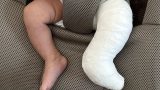 「生まれたときに足が少し曲がってたから、これをつけて治してるんだよ〜。痛くないよ〜。」